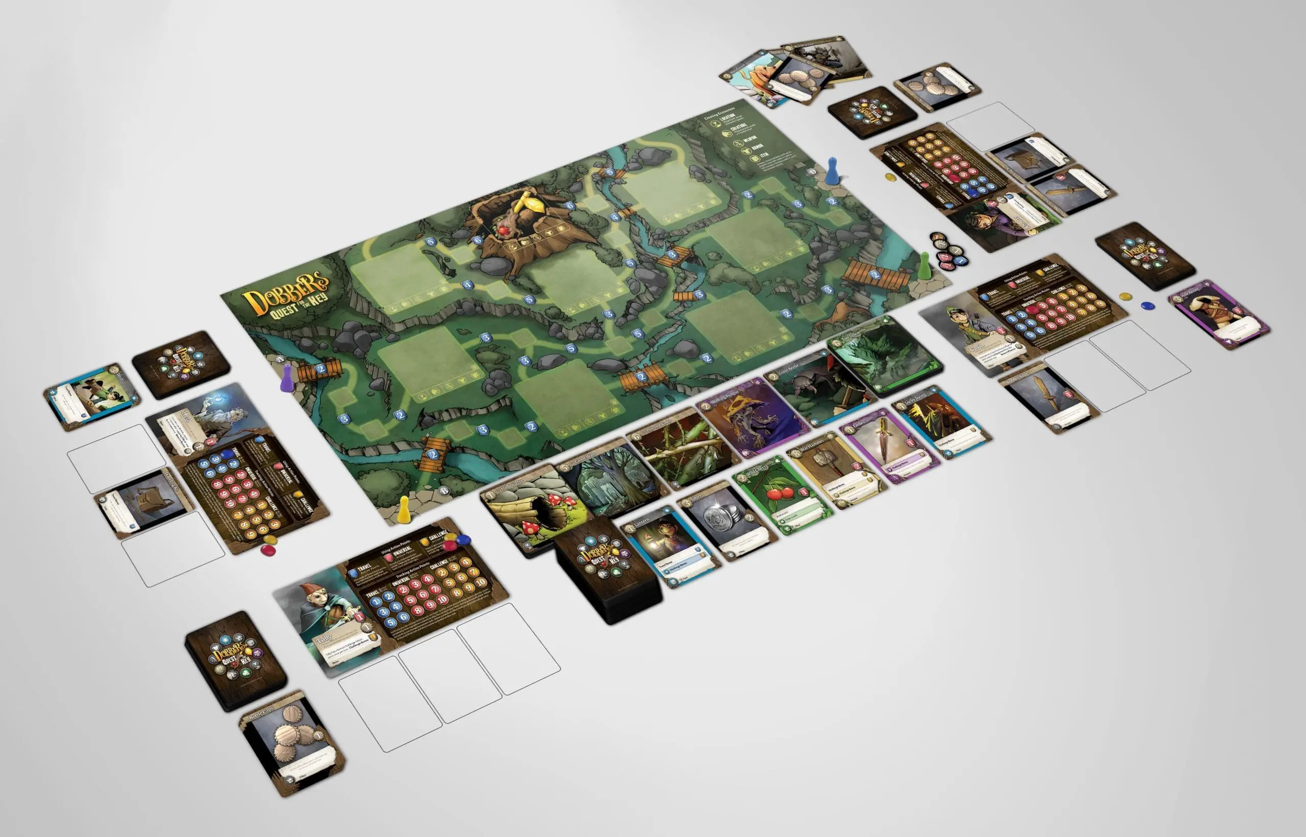 Dobbers: Quest for the Key offers surprisingly deep gameplay beneath its accessible mechanics, allowing numerous strategies for competitive or solo play. Part of the Seeds of Decay universe, this standalone game brings deck-building excitement to the whimsical-dark world where brave heroes must race against time and each other to prevent catastrophe.