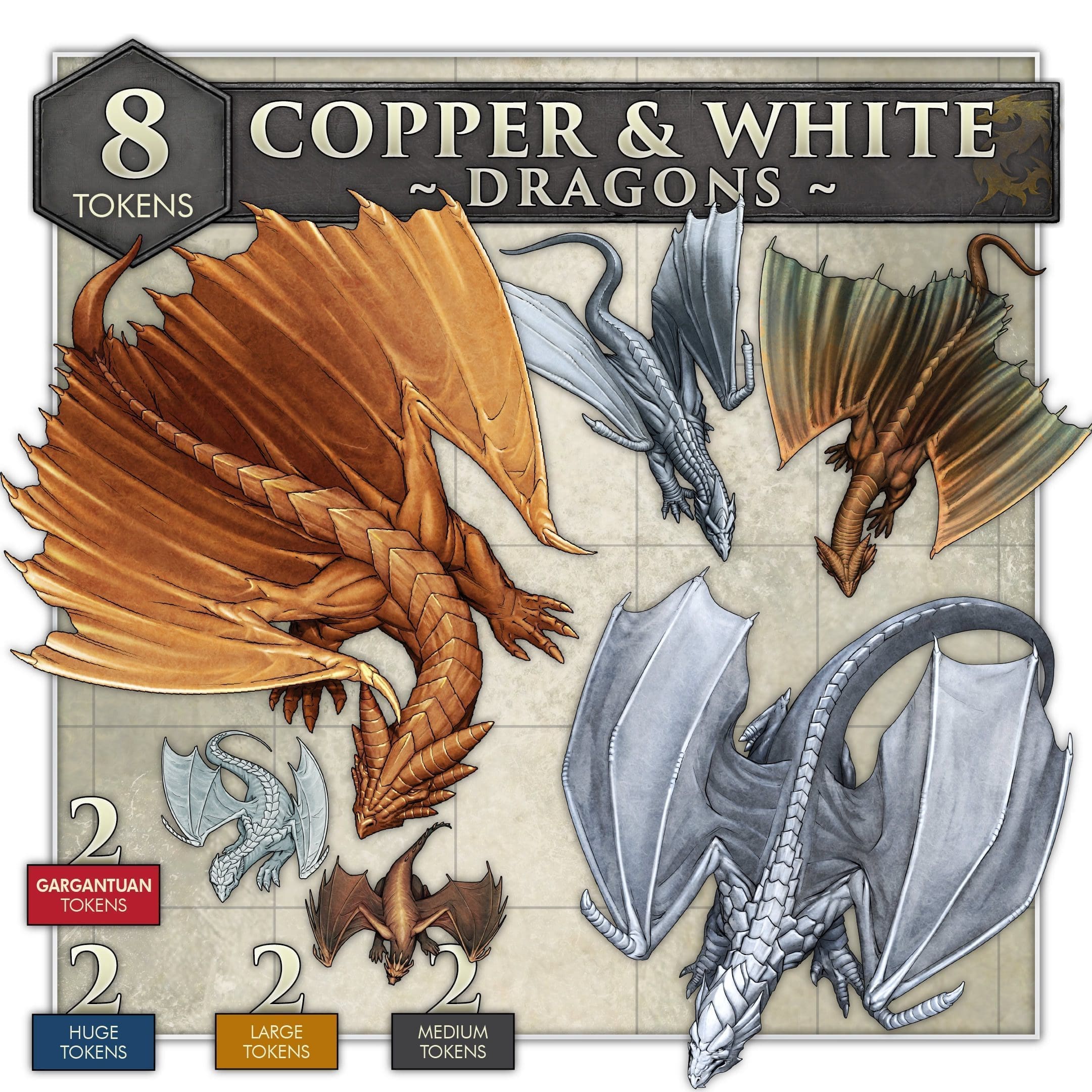 The Copper & White Dragons set includes 8 top-down tokens, each in three color variations, for use on your favorite VTT platform.