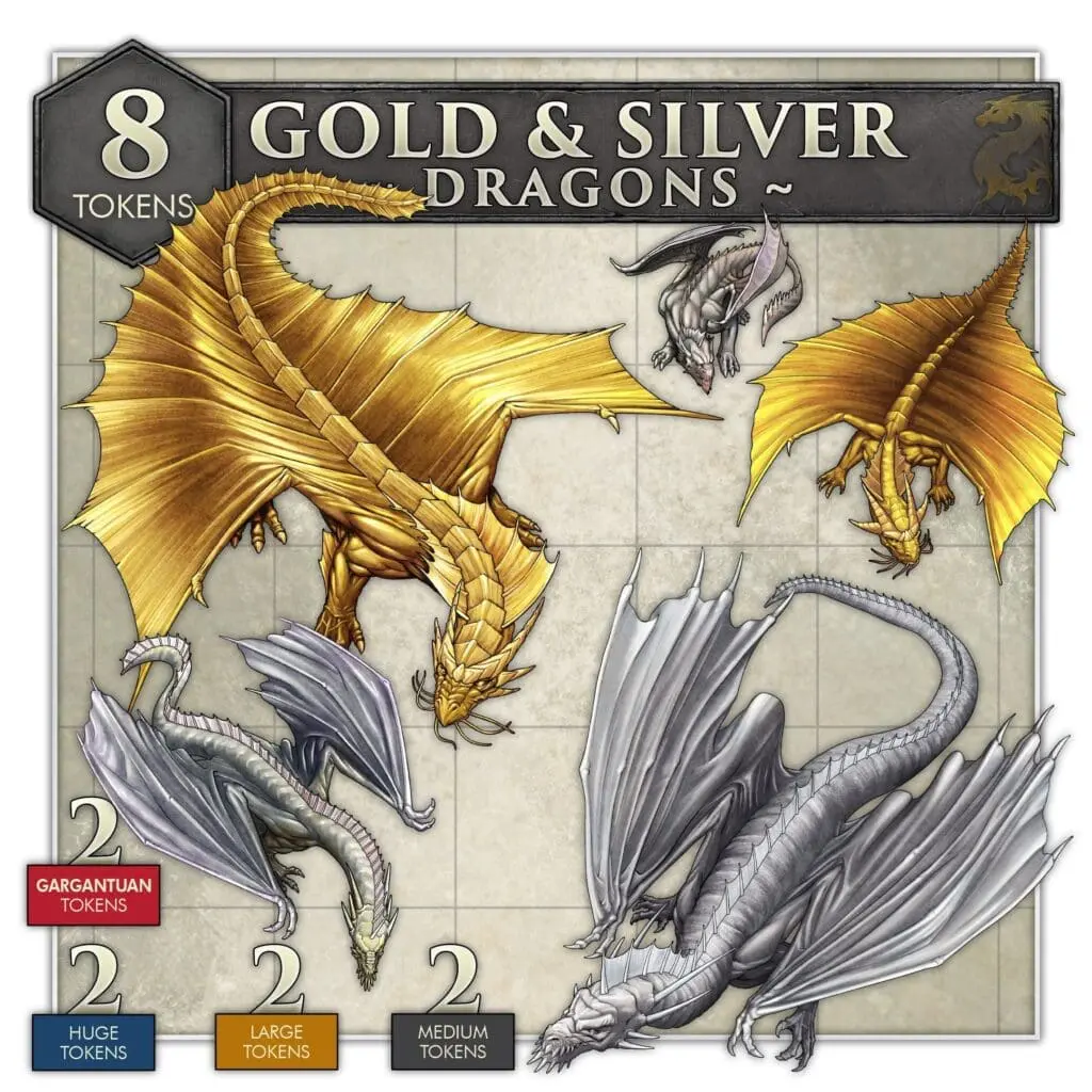 The Gold & Silver Dragons set includes 8 acrylic tokens for your RPG Sessions.