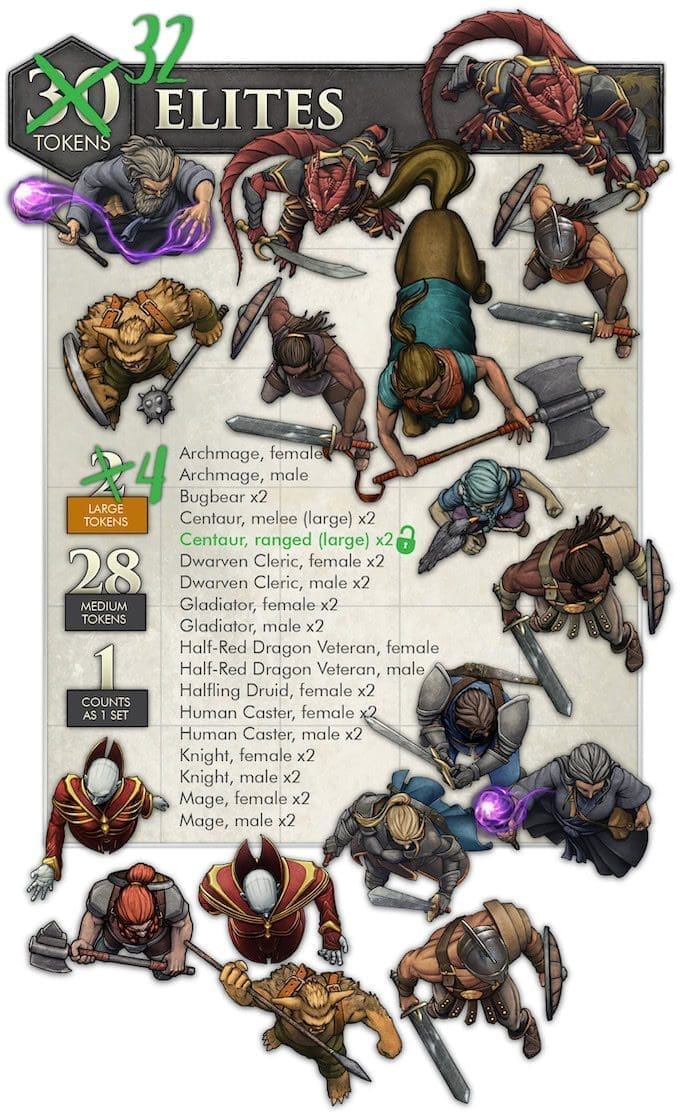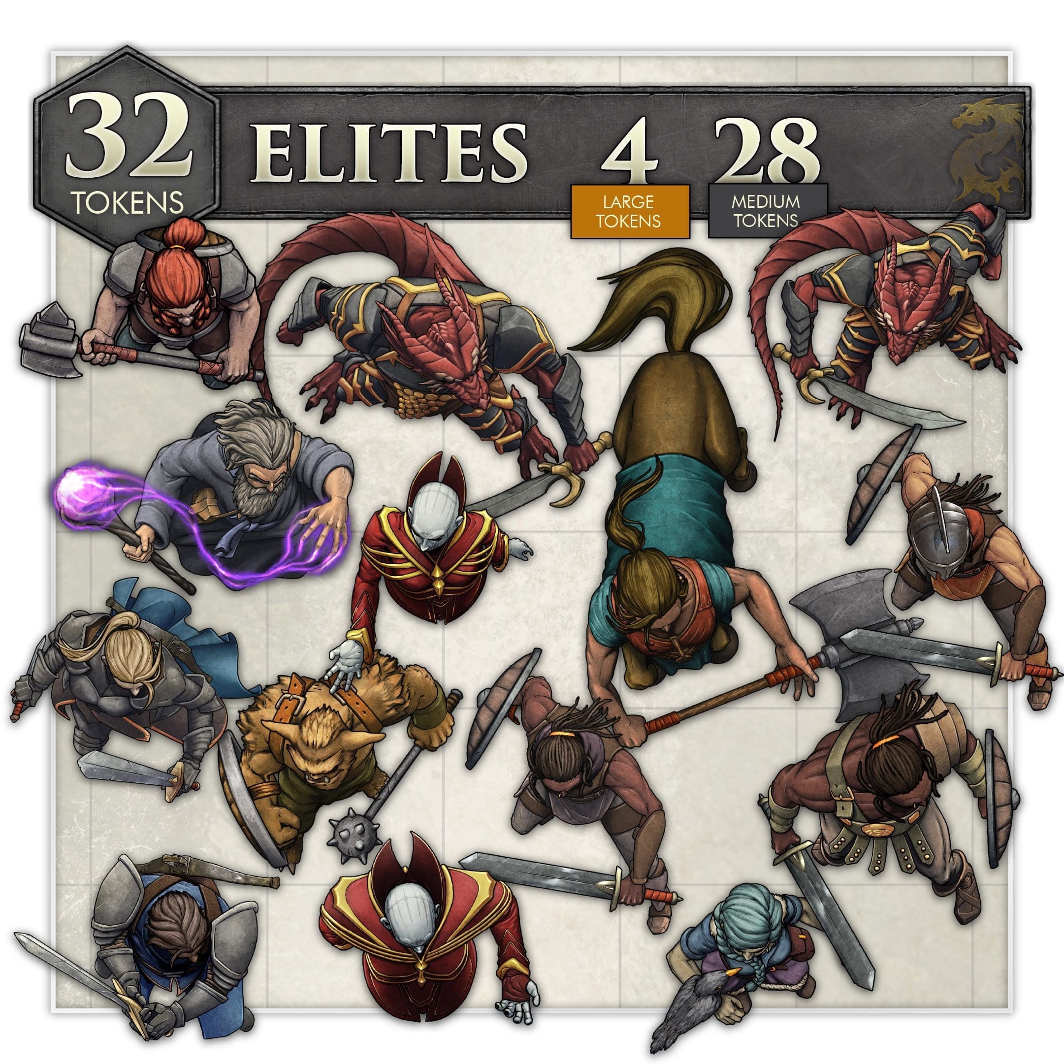 The Elites set includes 32 top-down tokens, each in three color variations, for use on your favorite VTT platform.