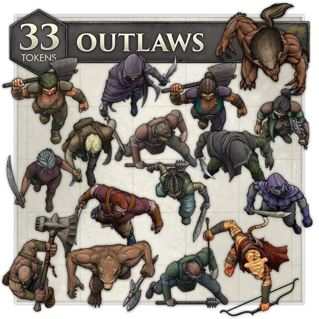 The Outlaws set includes 33 top-down digital tokens , each in three color variations, for use on your favorite VTT platform.