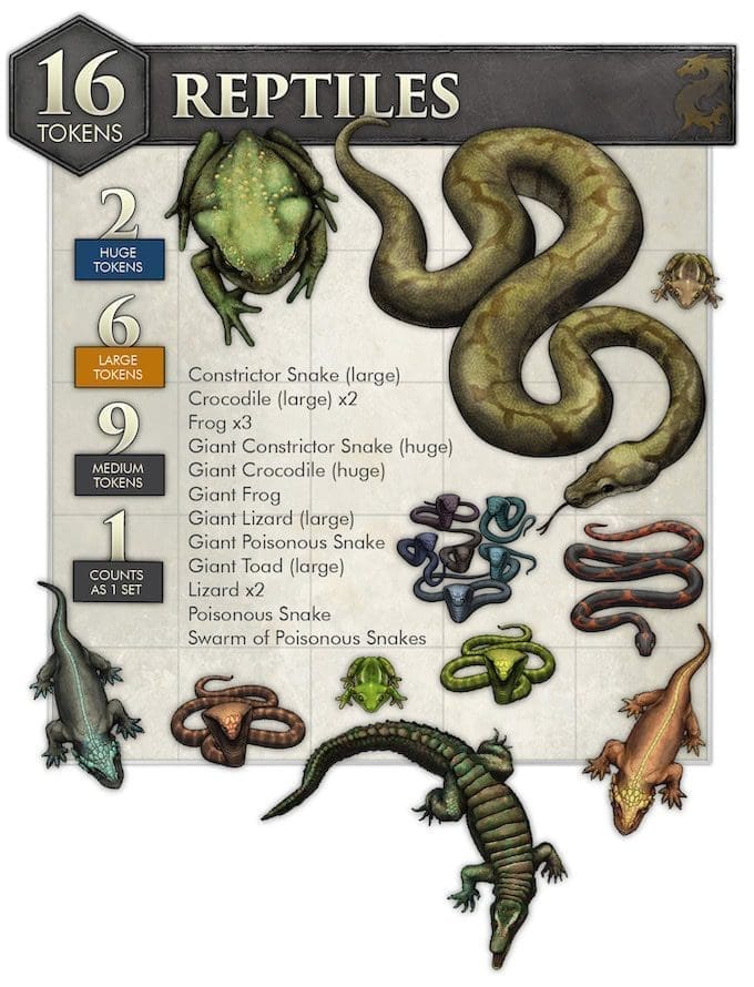The Reptiles set includes 16 acrylic tokens for your RPG Sessions.