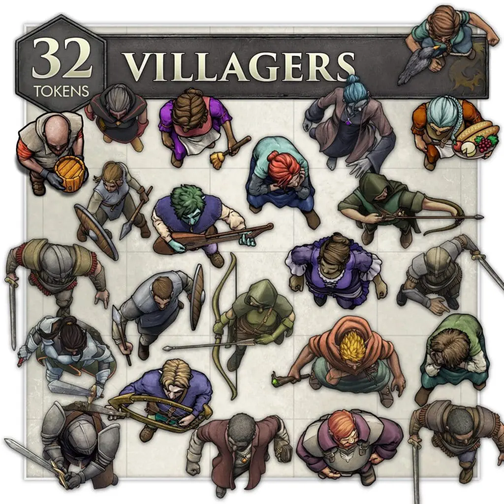The Villagers set includes 32 digital, top-down tokens, each in three color variations, for use on your favorite VTT platform.